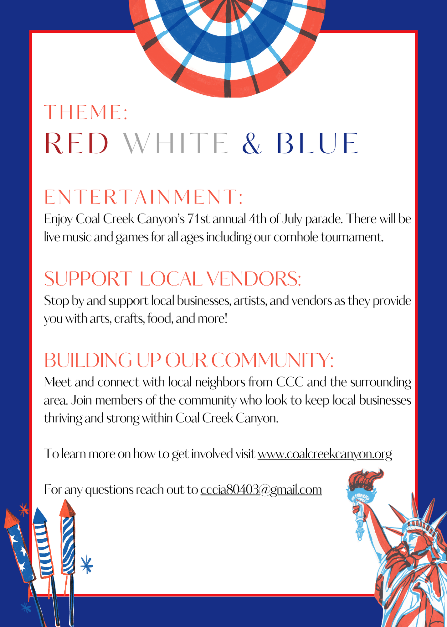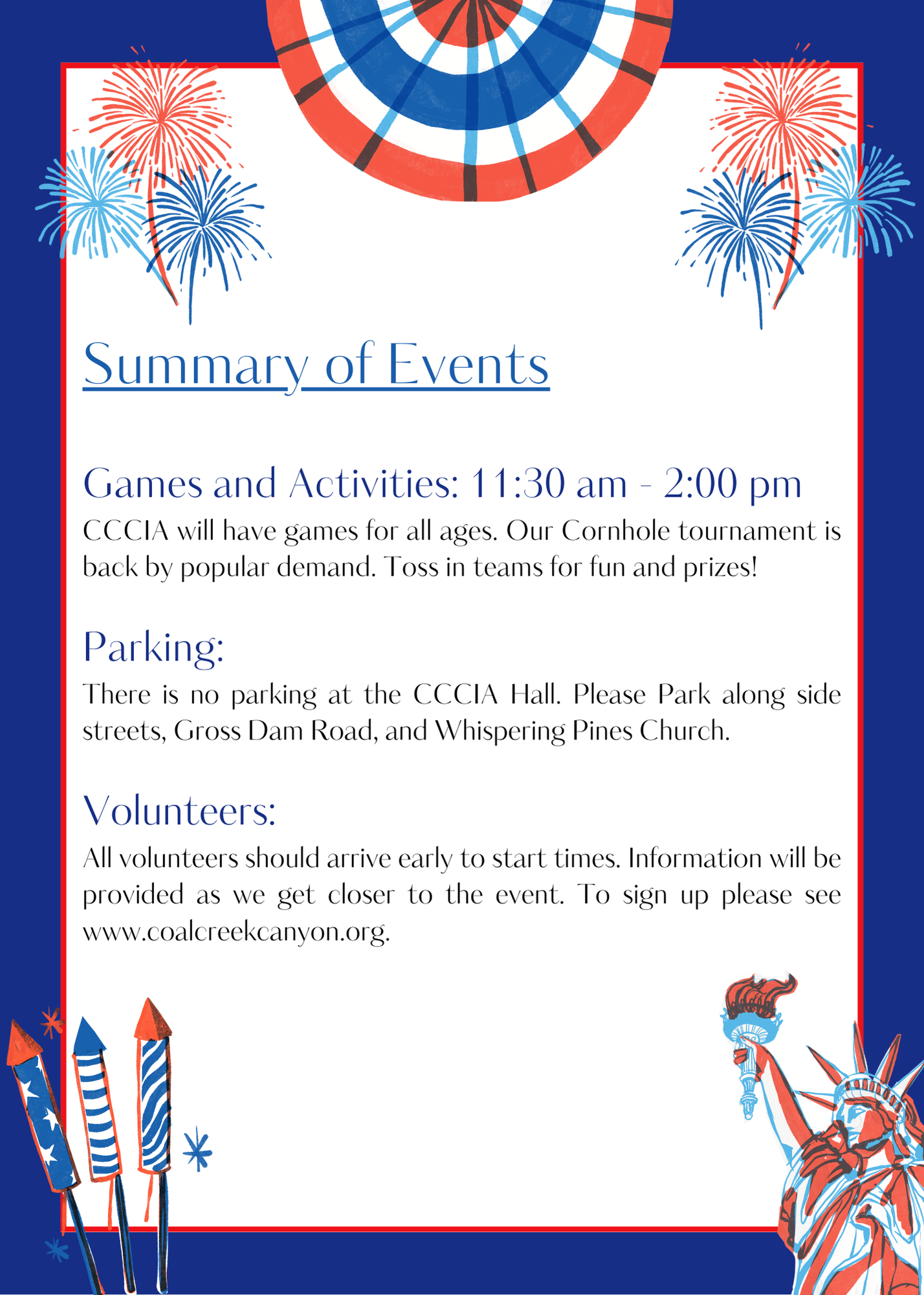 Enjoy Coal Creek Canyon's 71st annual 4th of July parade. There will be live music and games for all ages including our cornhole tournament.