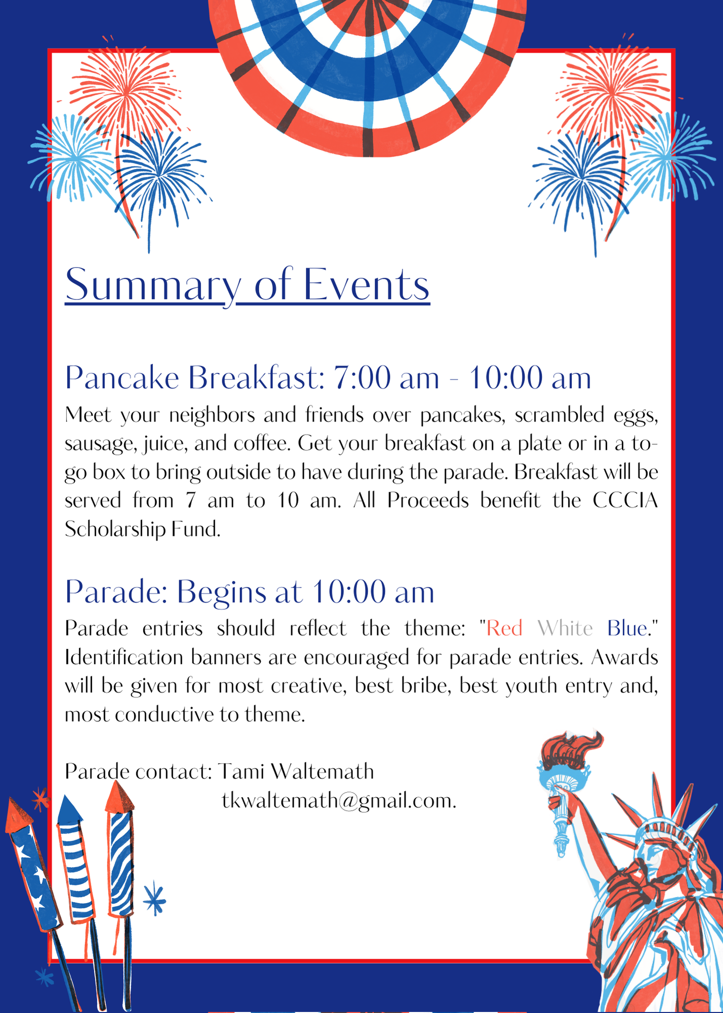 We love seeing the creativity at the parade each year. Embrace the theme and decorate a float, car, animal, or yourselves! This year the theme is "Red White & Blue". Show us what you've got and you may just win a prize in one of many categories, including: Most Creative, Best of Theme, Best Music, Best Judge Bribe, and more!